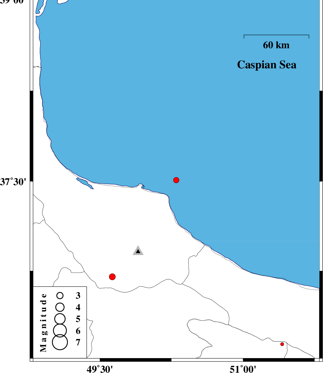 | 2013/05/15 | 08:57:48.2 | 13:27:48.2 | 37.51 | 50.3 | 14 | ML:2.7 | Caspian Sea, 41 km North of Rudsar | ||