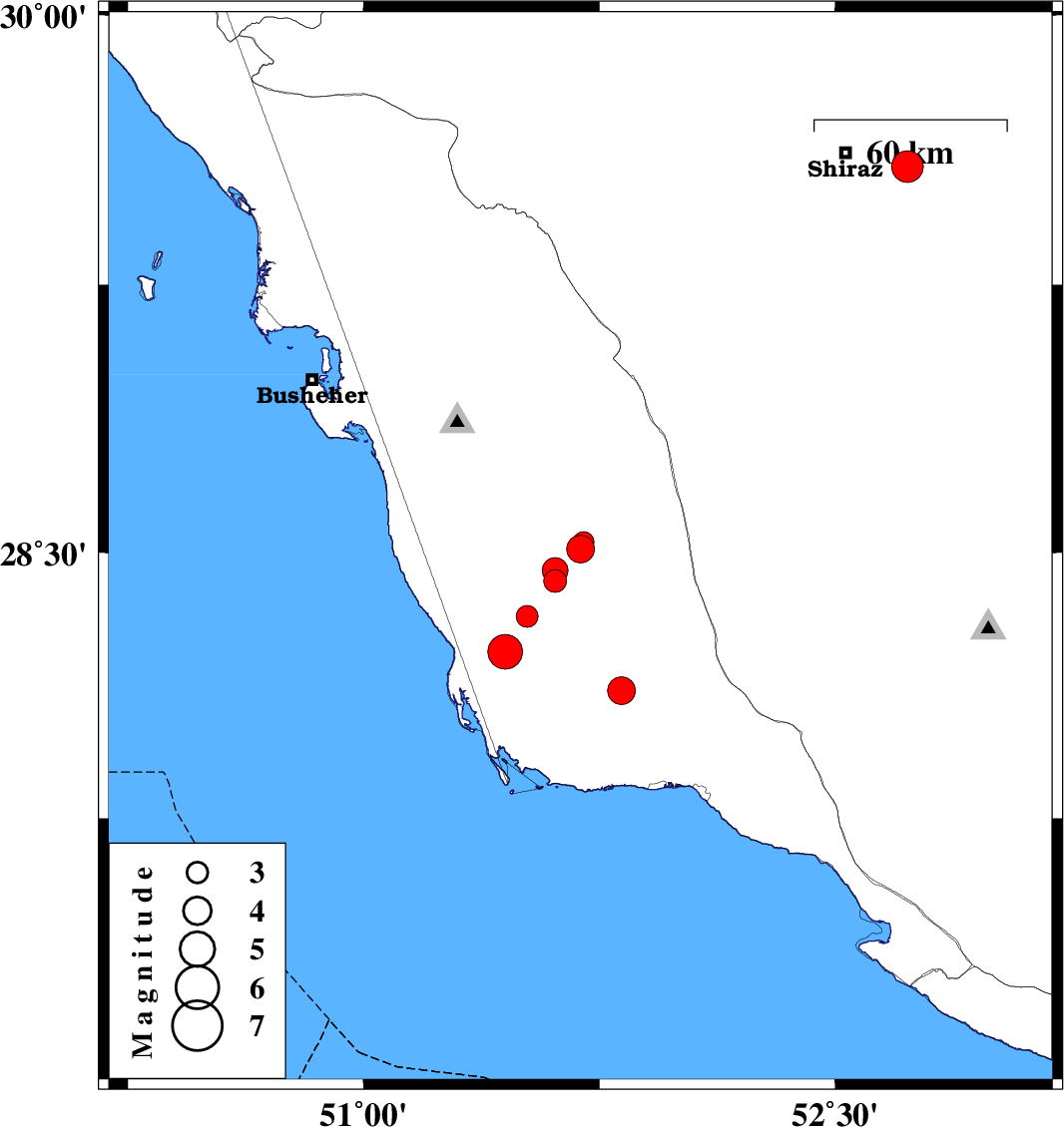 | 2013/05/09 | 03:29:37.2 | 07:59:37.2 | 28.11 | 51.82 | 31 | ML:4 | Bushehr Province, 39 km North-West of Bandar-e kangan |
