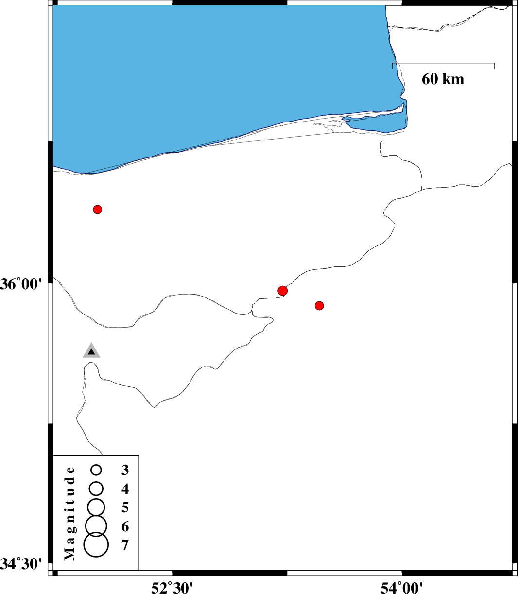 | 2013/05/12 | 07:19:30.9 | 11:49:30.9 | 36.39 | 52.01 | 14 | ML:2.6 | Mazandaran Province, 20 km South of Nur |