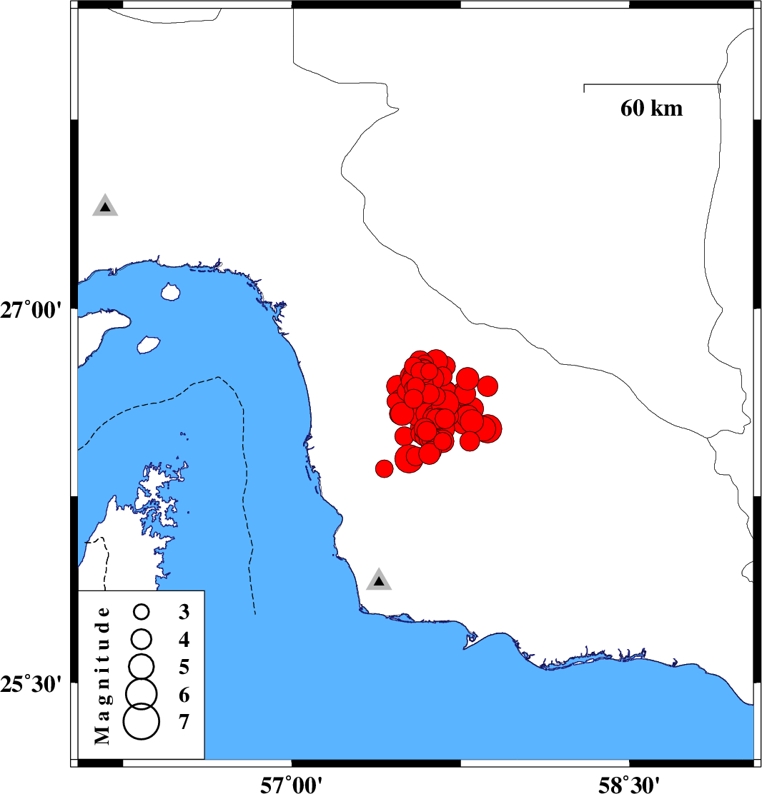 2013/05/14 10:02:36.7 14:32:36.7 26.5157.614 ML:4 Hormozgan Province, 100 km South-East of Manujan