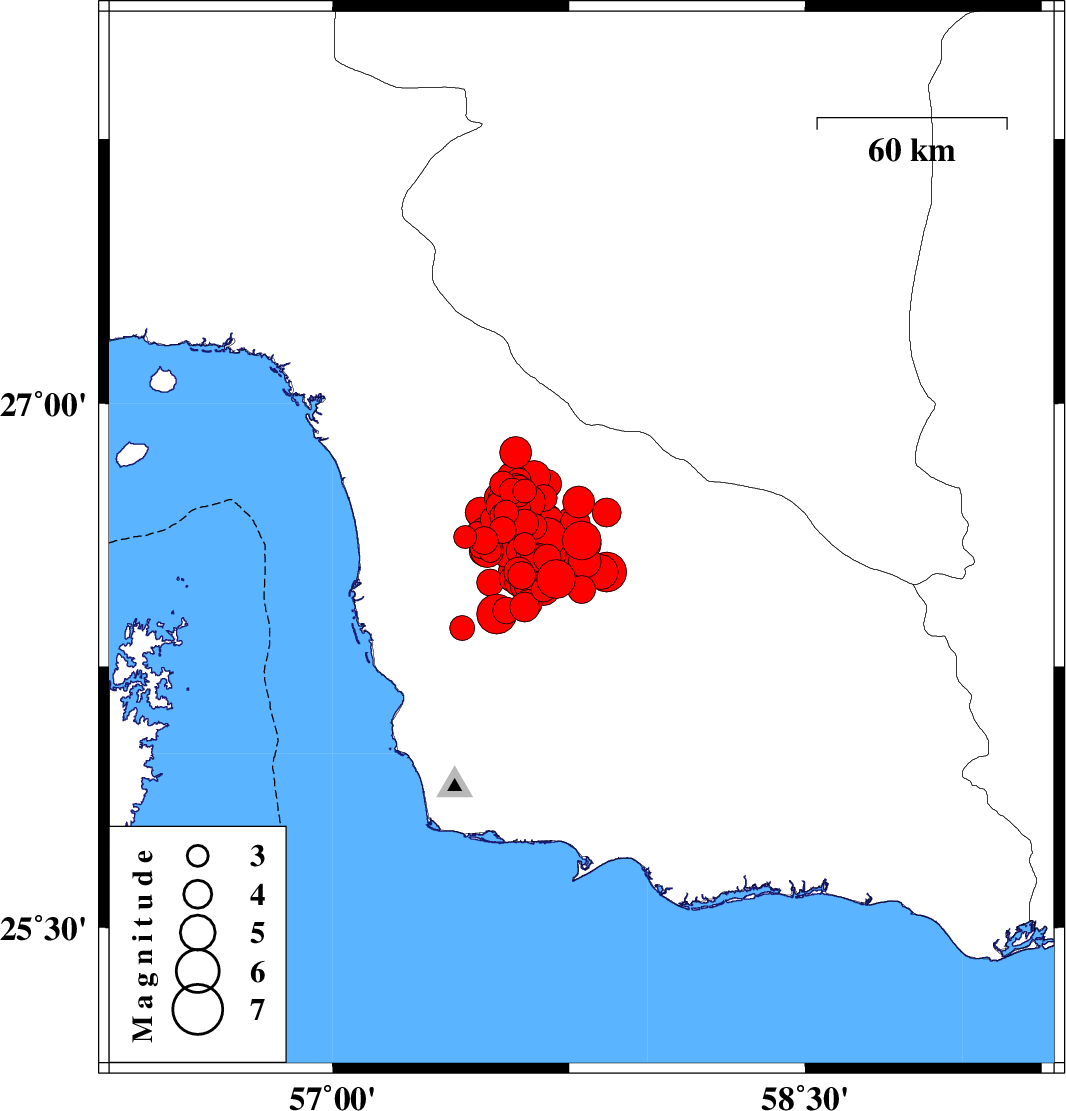 2013/05/14 10:02:36.7 14:32:36.7 26.5157.614 ML:4 Hormozgan Province, 100 km South-East of Manujan
