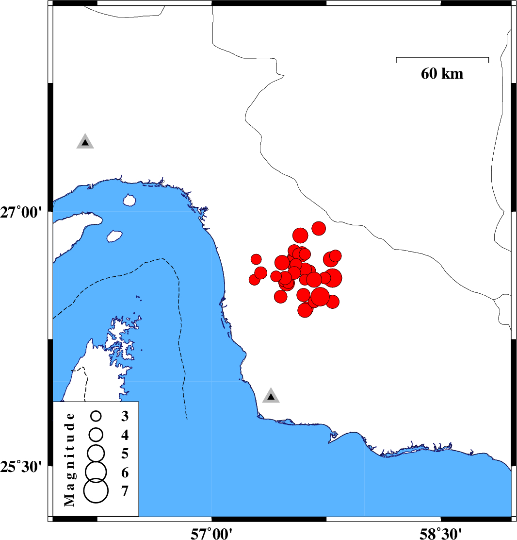 2013/05/13 | 01:42:56.1 | 06:12:56.1 | 26.42 | 57.61 | 14 | ML:4.3 | Hormozgan Province, 89 km North-West of Jask | ||