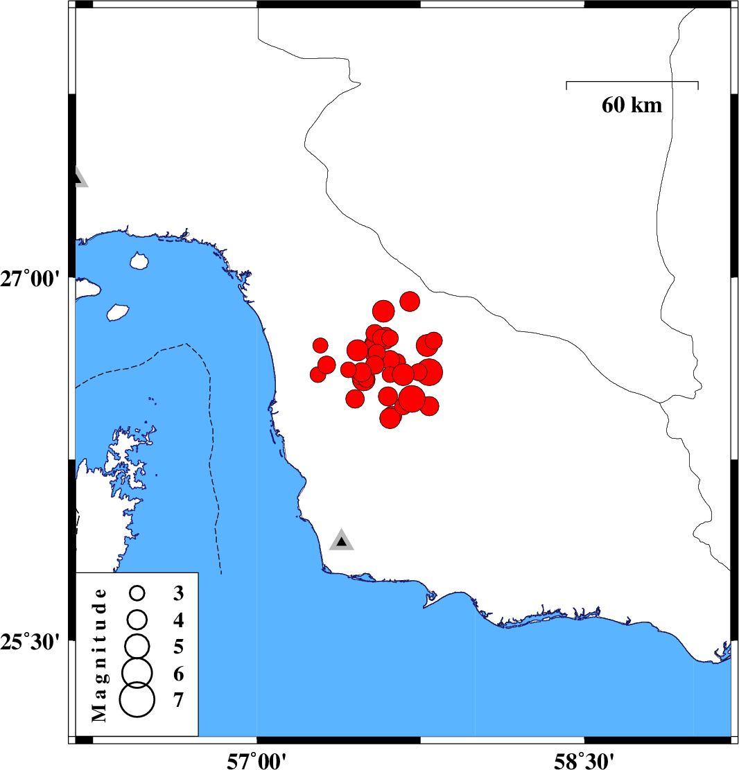 2013/05/14 10:02:36.7 14:32:36.7 26.5157.614 ML:4 Hormozgan Province, 100 km South-East of Manujan