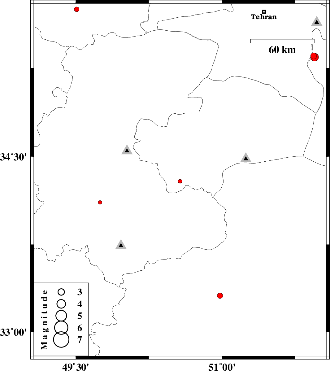 | 2013/05/20 | 09:46:55.1 | 14:16:55.1 | 34.11 | 49.75 | 27 | ML:1.7 | Markazi Province, 6 km Arak | ||