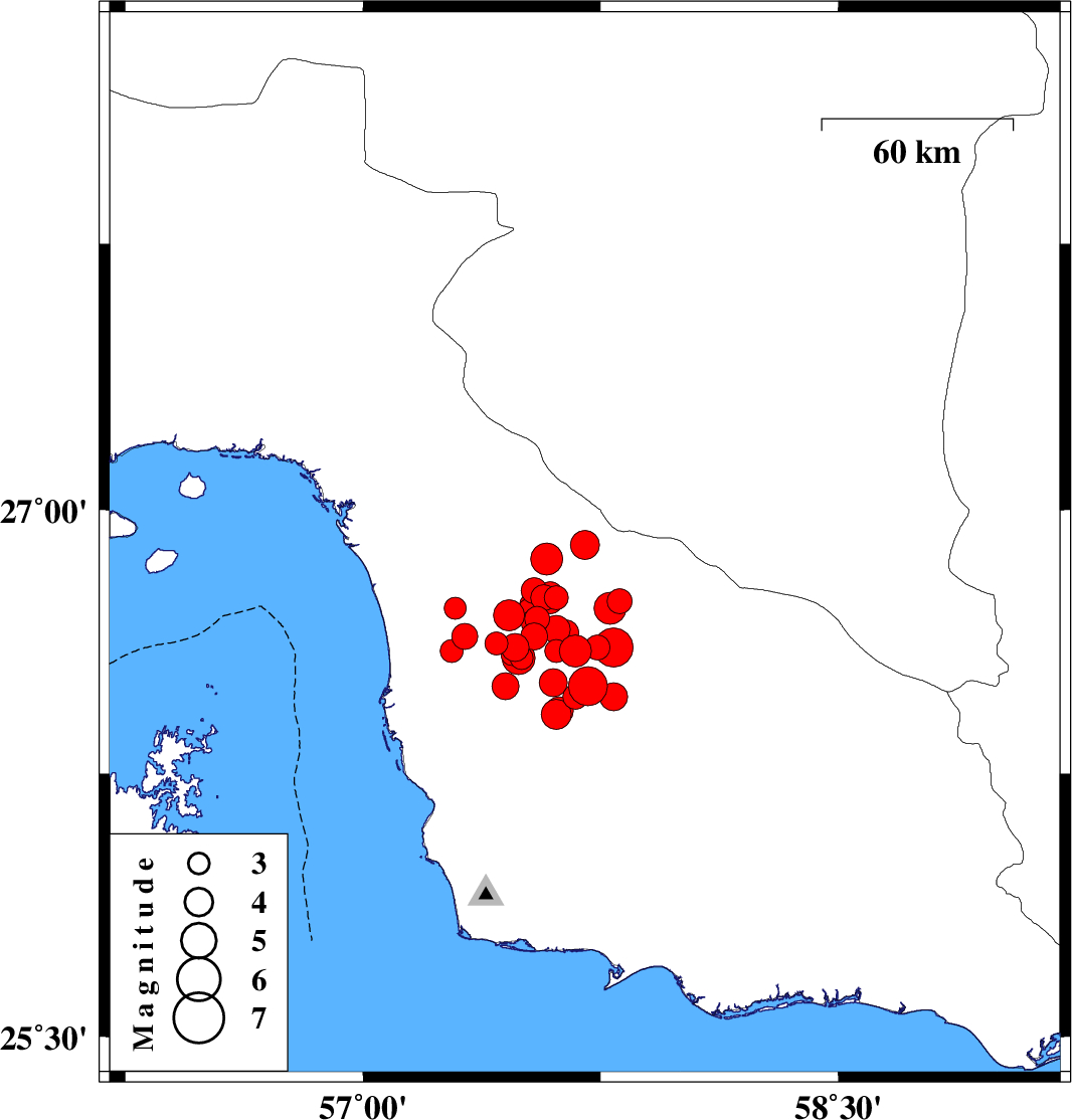 2013/05/13 | 01:42:56.1 | 06:12:56.1 | 26.42 | 57.61 | 14 | ML:4.3 | Hormozgan Province, 89 km North-West of Jask | ||