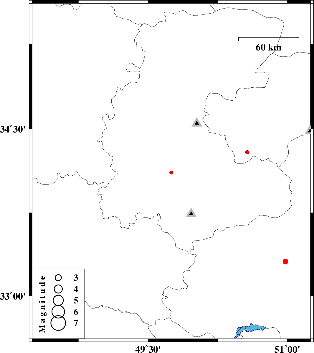 | 2013/05/20 | 09:46:55.1 | 14:16:55.1 | 34.11 | 49.75 | 27 | ML:1.7 | Markazi Province, 6 km Arak |