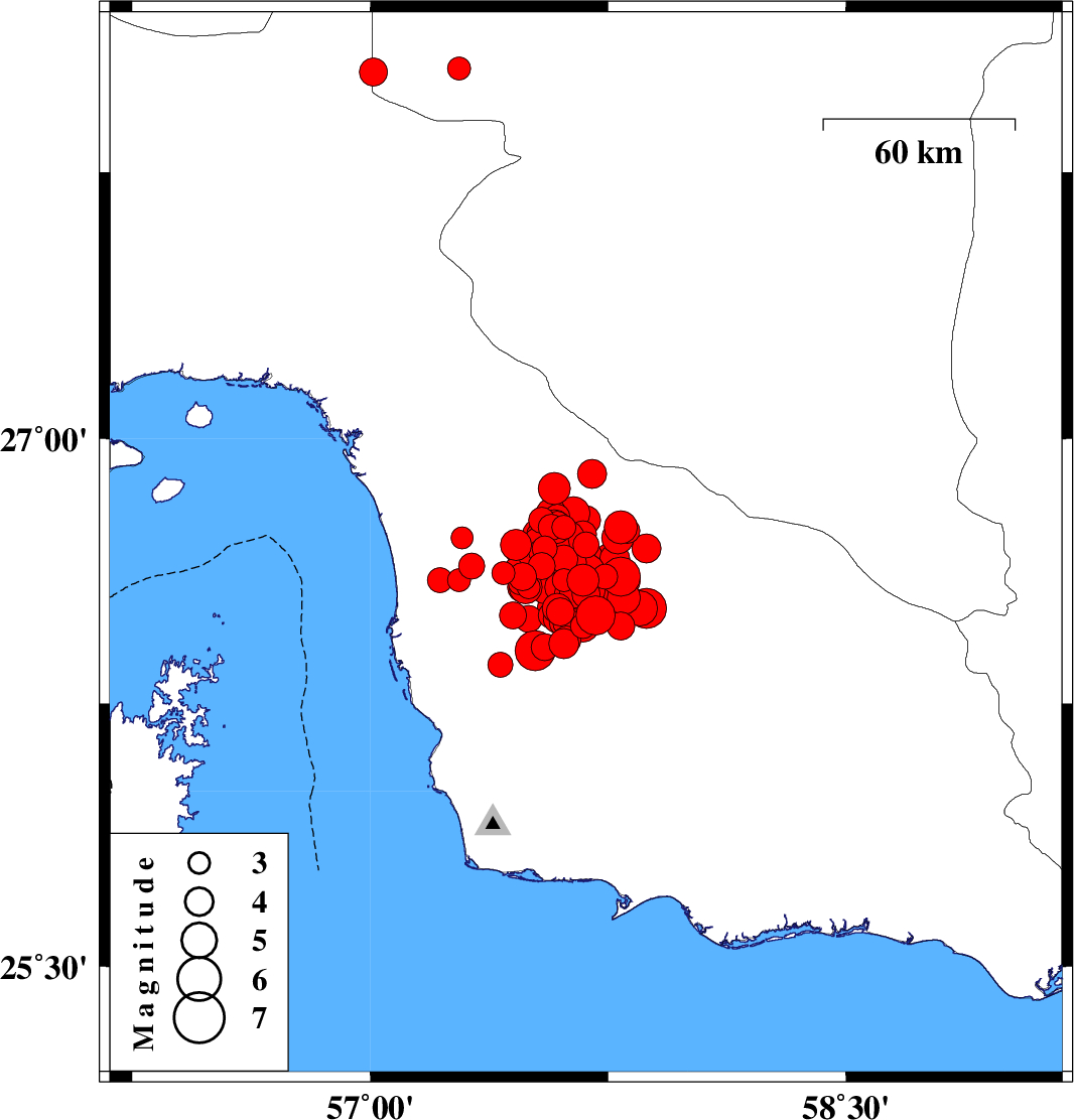 2013/05/13 | 01:42:56.1 | 06:12:56.1 | 26.42 | 57.61 | 14 | ML:4.3 | Hormozgan Province, 89 km North-West of Jask | ||