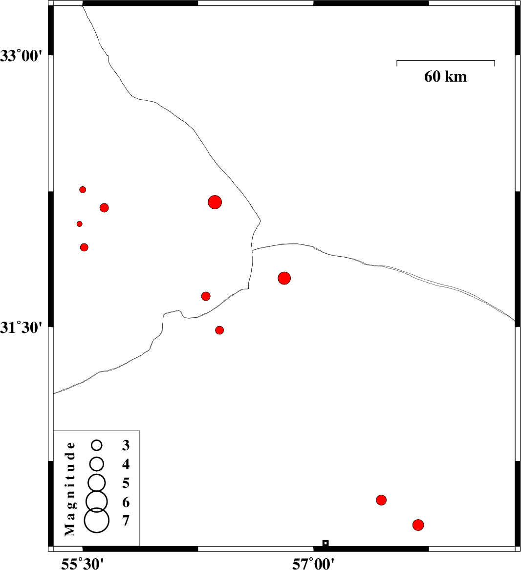 2013/04/27 | 03:22:20.5 | 07:52:20.5 | 30.53 | 57.44 | 16 | ML:2.9 | Kerman Province, 44 km North-East of Kerman | ||