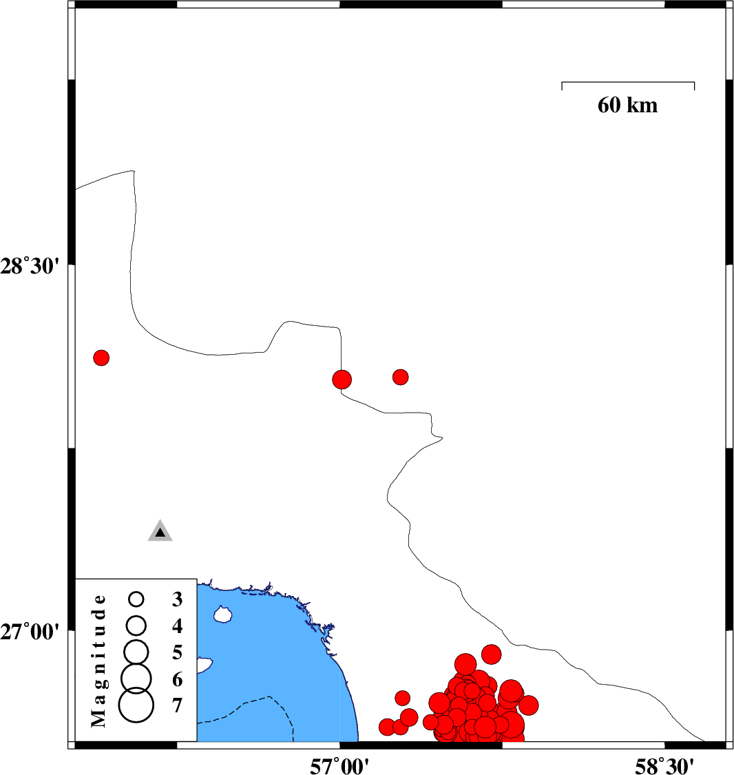 2013/05/11 | 04:09:27.9 | 08:39:27.9 | 26.55 | 57.8 | 15 | ML:4.7 | Hormozgan Province, 102 km North of Jask | ||