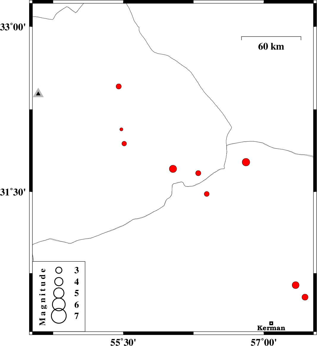 2013/05/24 | 04:03:59.9 | 08:33:59.9 | 30.64 | 57.34 | 16 | ML:3.4 | Kerman Province, 46 km North-East of Kerman | ||