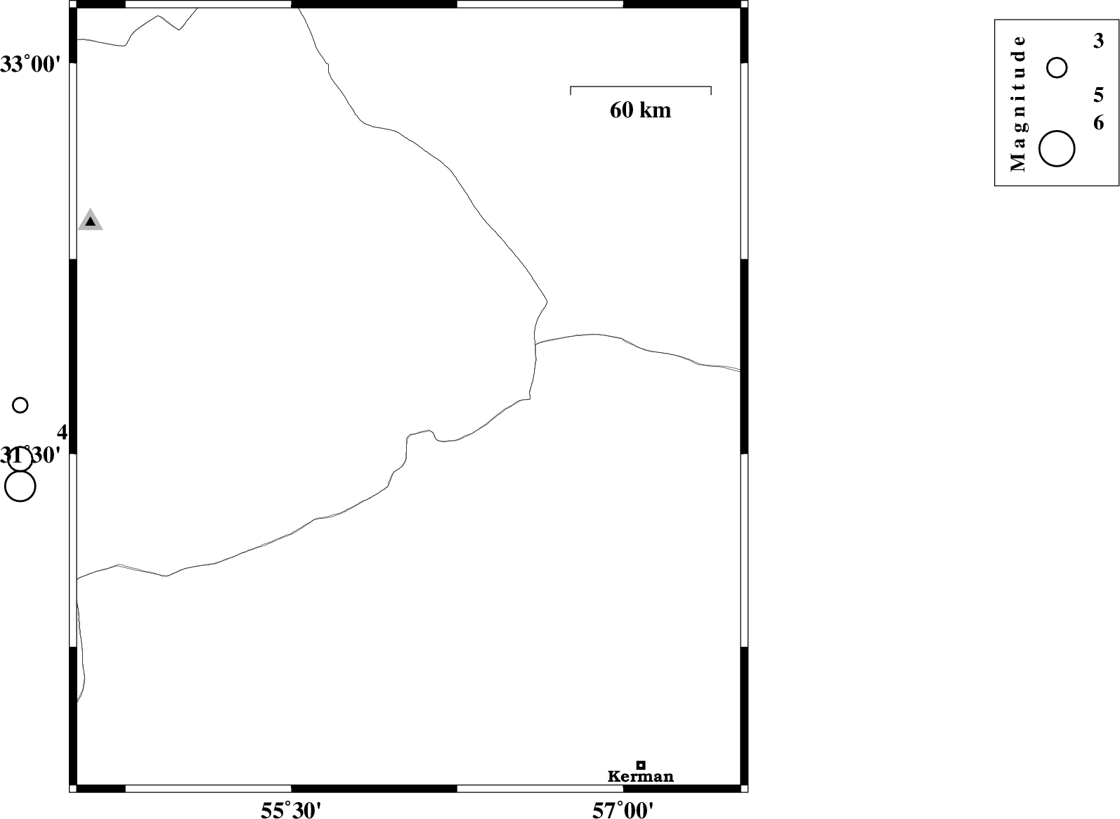 2013/05/24 | 04:03:59.9 | 08:33:59.9 | 30.64 | 57.34 | 16 | ML:3.4 | Kerman Province, 46 km North-East of Kerman | ||