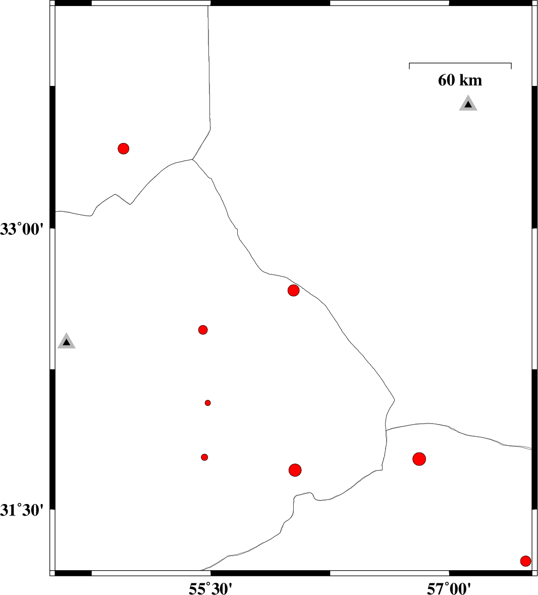 2013/05/27 | 12:24:37.1 | 16:54:37.1 | 32.67 | 56.02 | 30 | ML:3.3 | Yazd Province, 132 km North-East of Bafq | ||