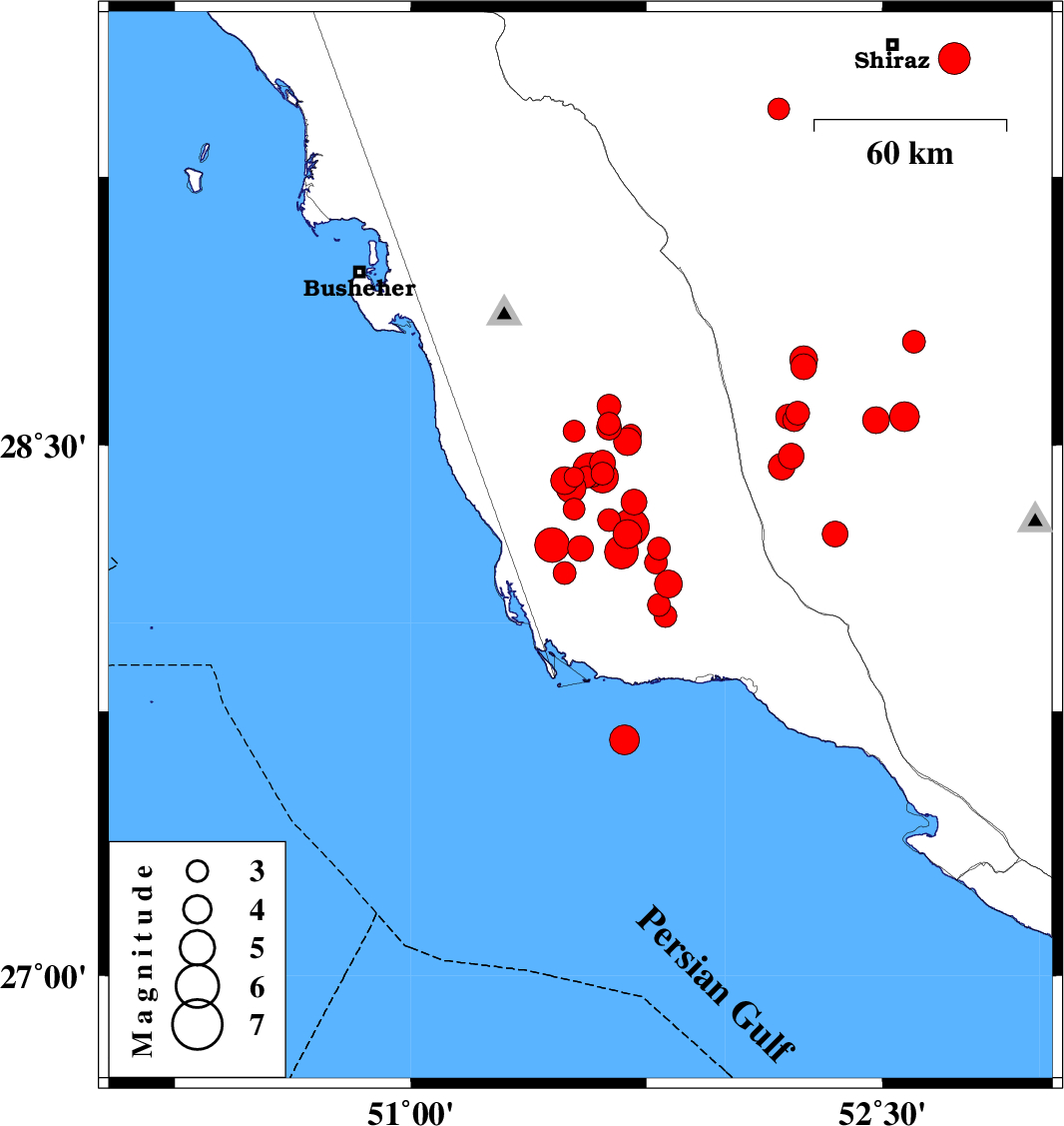 2013/05/09 | 03:29:37.2 | 07:59:37.2 | 28.11 | 51.82 | 31 | ML:4 | Bushehr Province, 39 km North-West of Bandar-e kangan | ||