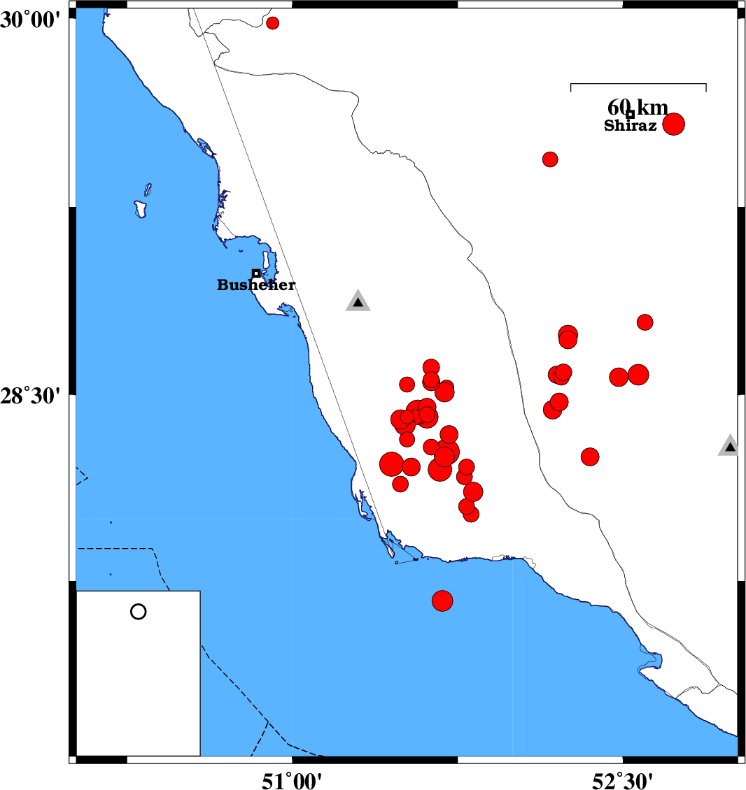 2013/05/09 | 03:29:37.2 | 07:59:37.2 | 28.11 | 51.82 | 31 | ML:4 | Bushehr Province, 39 km North-West of Bandar-e kangan | ||