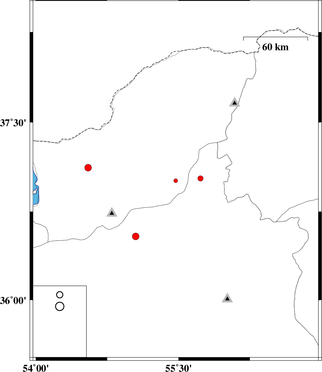 2013/05/21 | 05:30:25.4 | 10:00:25.4 | 37.12 | 54.55 | 18 | ML:3.3 | Golestan Province, 14 km North of Aq Qaleh | ||