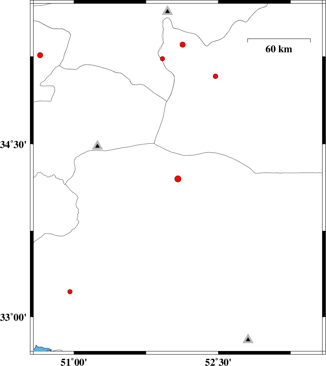 2013/06/02 | 22:52:21.4 | 03:22:21.4 | 34.2 | 52.08 | 18 | ML:3 | Esfahan Province, 58 km North-East of Aran va bidgol | ||