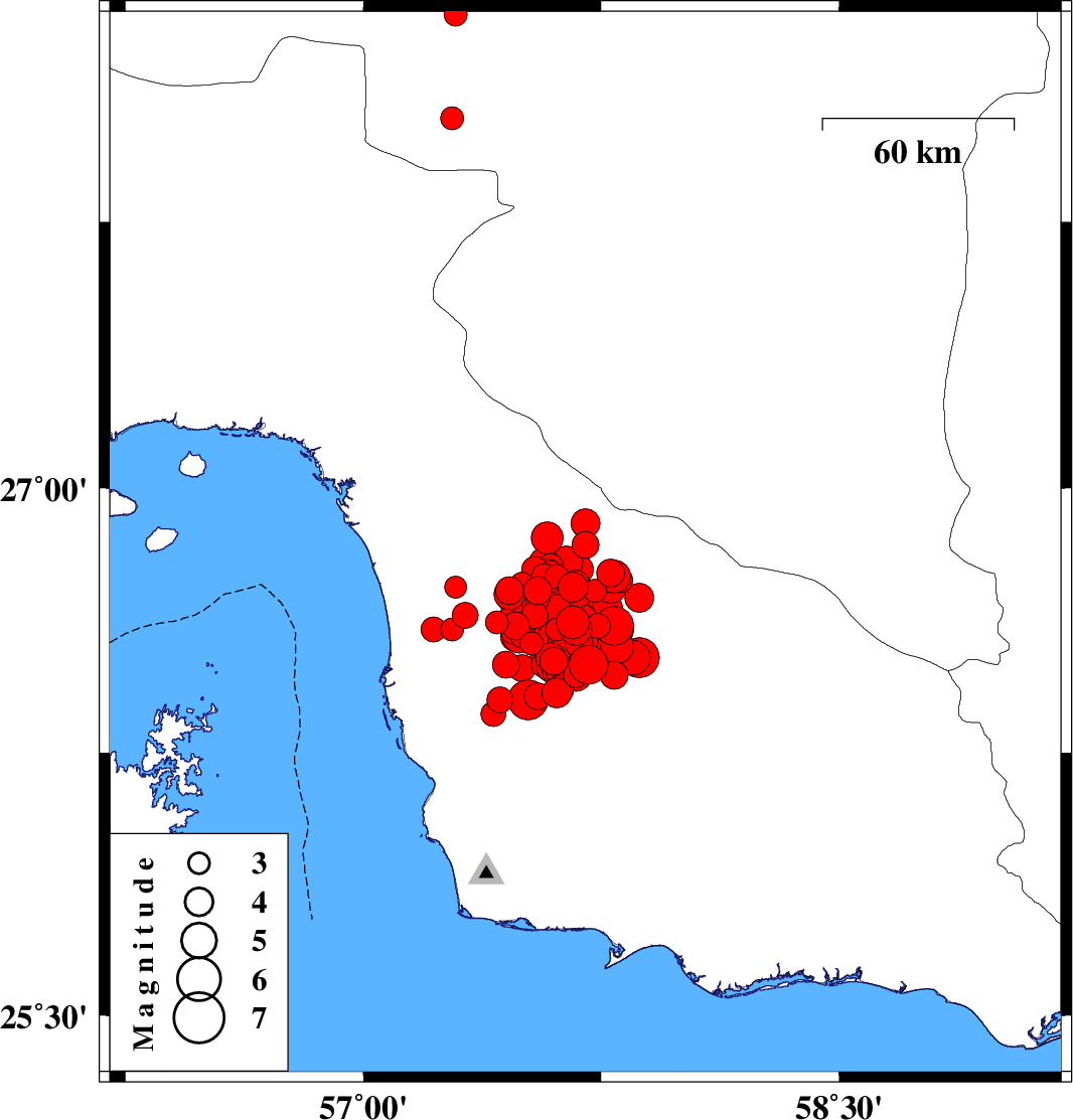 2013/05/13 | 01:42:56.1 | 06:12:56.1 | 26.42 | 57.61 | 14 | ML:4.3 | Hormozgan Province, 89 km North-West of Jask | ||