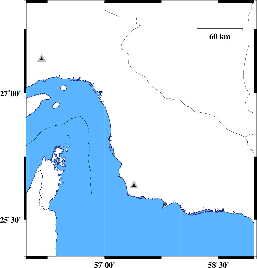 2013/05/13 | 01:42:56.1 | 06:12:56.1 | 26.42 | 57.61 | 14 | ML:4.3 | Hormozgan Province, 89 km North-West of Jask | ||