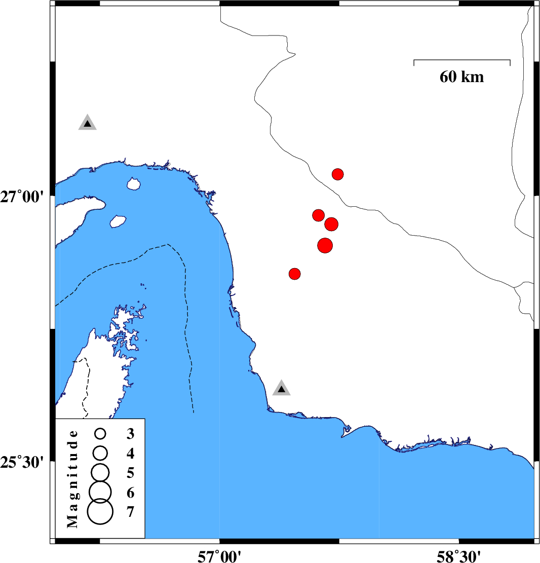 2013/06/09 | 02:06:08.2 | 06:36:08.2 | 26.56 | 57.47 | 14 | ML:3.2 | Hormozgan Province, 94 km South of Manujan | ||