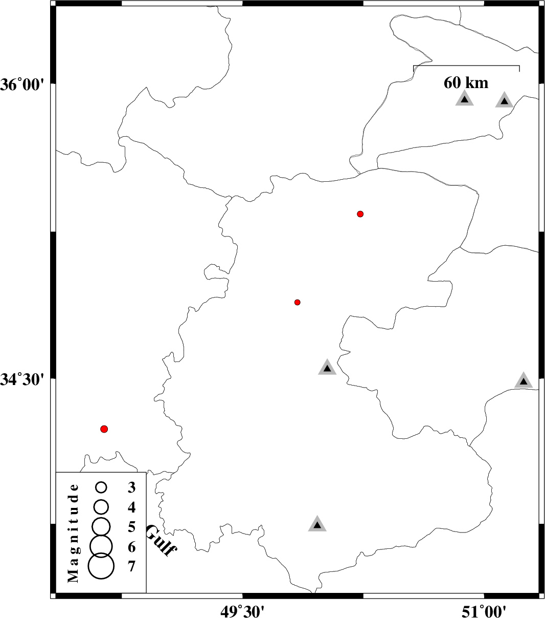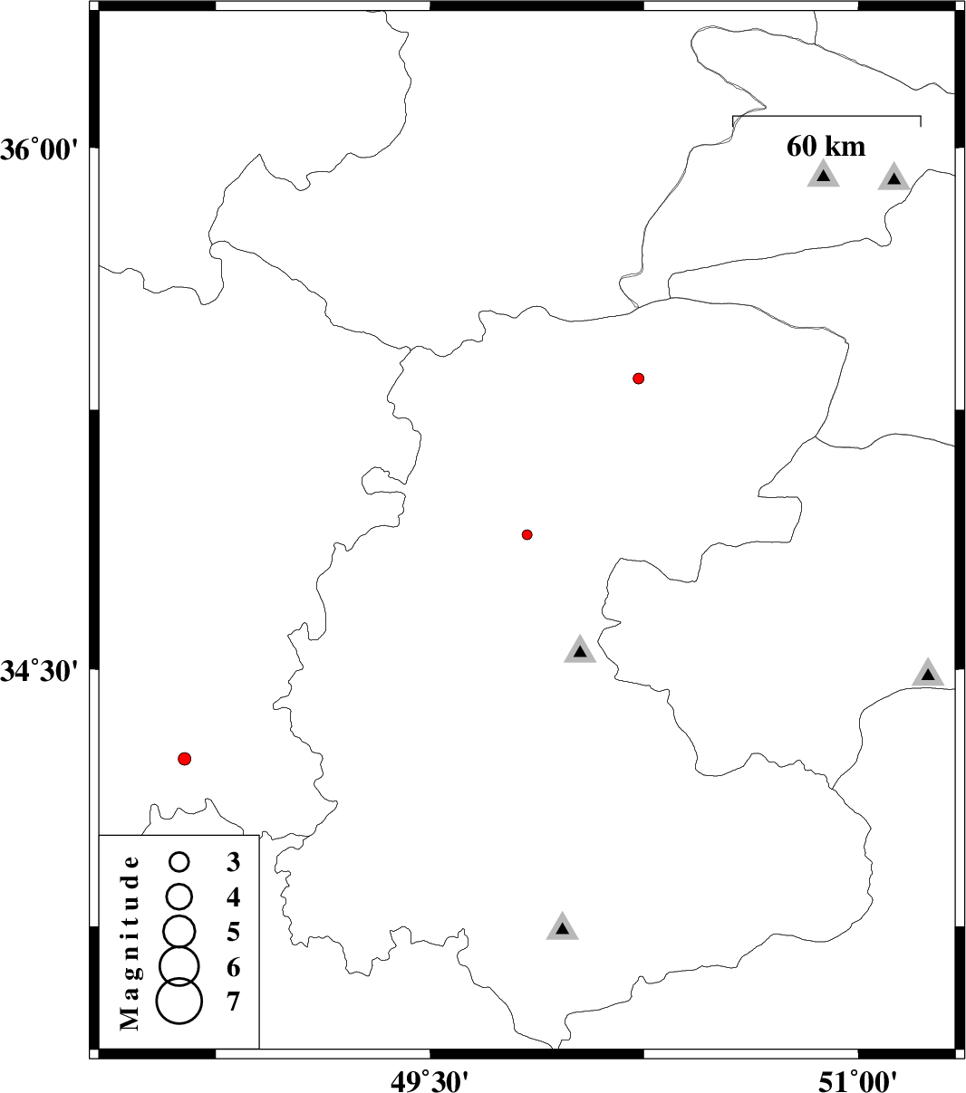 | 2013/06/12 | 01:29:34.4 | 05:59:34.4 | 34.89 | 49.84 | 14 | ML:1.5 | Markazi Province, 28 km North-West of Tafresh | ||