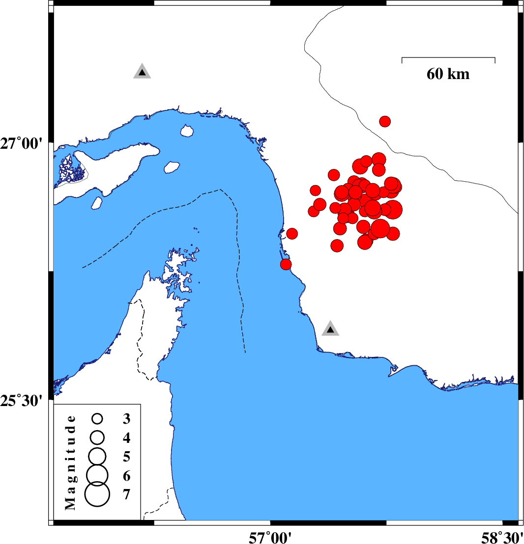 2013/06/12 | 06:35:05.7 | 11:05:05.7 | 26.29 | 57.1 | 15 | ML:3.2 | Oman Sea, 96 km South of Minab | ||