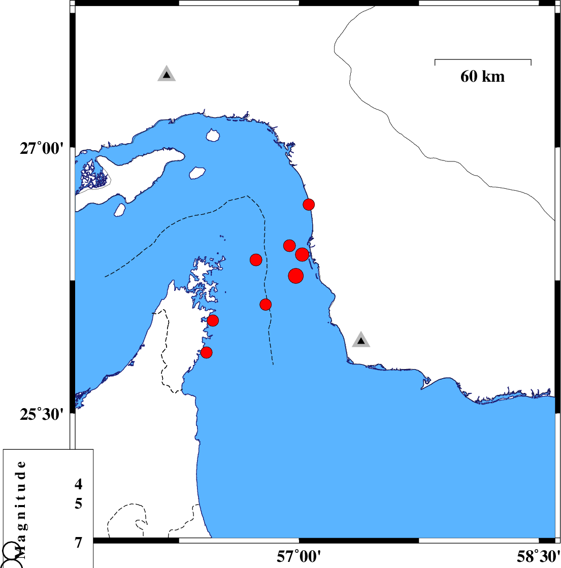 2013/06/09 | 02:06:08.2 | 06:36:08.2 | 26.56 | 57.47 | 14 | ML:3.2 | Hormozgan Province, 94 km South of Manujan | ||