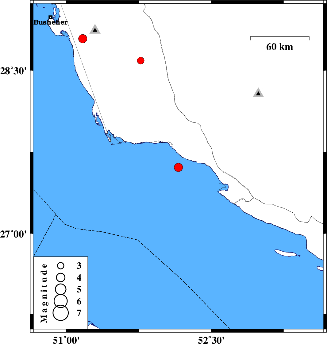 2013/06/26 | 08:18:09.8 | 12:48:09.8 | 27.61 | 52.16 | 14 | ML:3.9 | Persian Gulf, 26 km South of Bandar-e kangan | ||