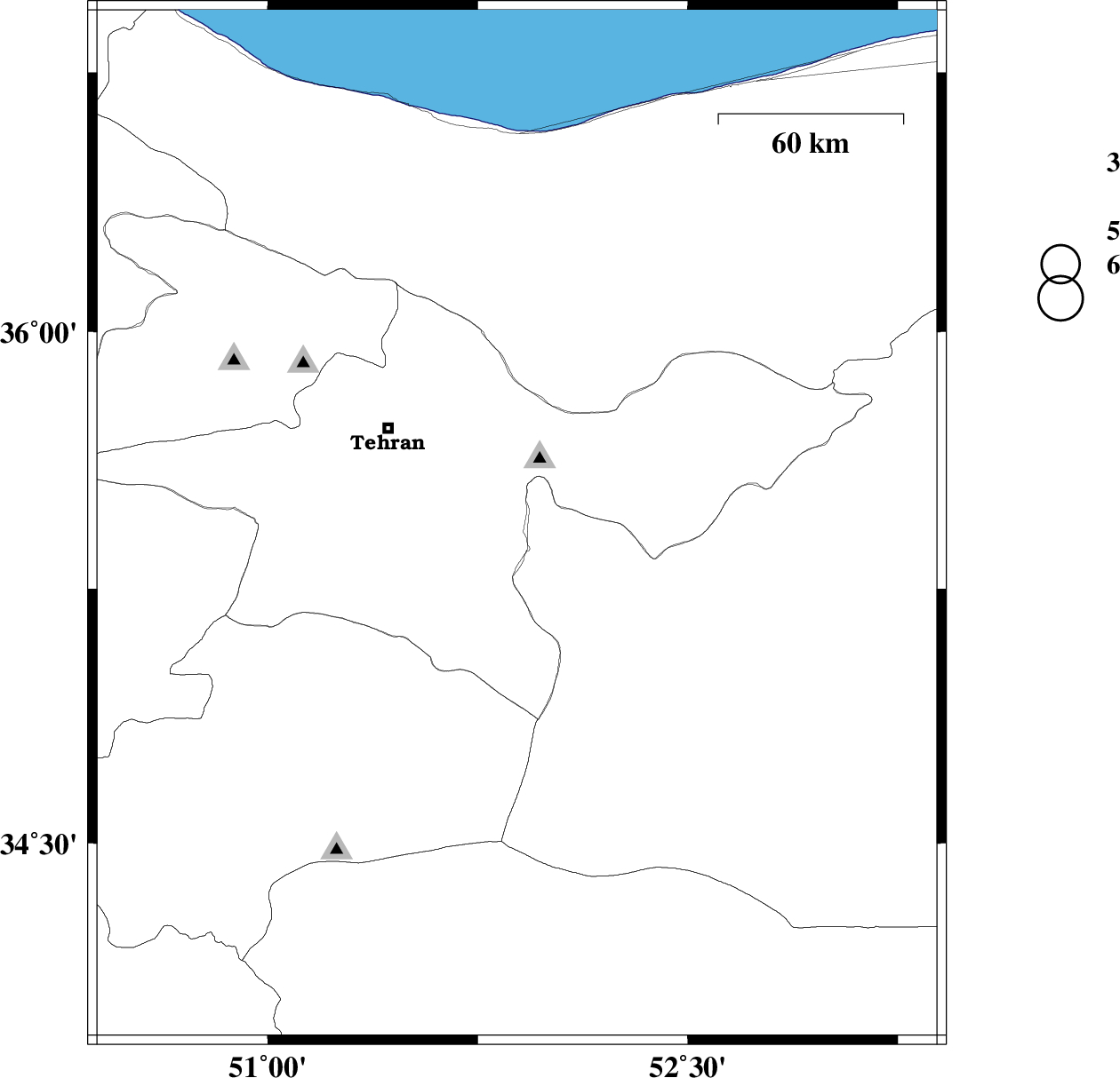 2013/06/28 | 08:45:05.0 | 13:15:05.0 | 36 | 52.27 | 11 | ML:2.3 | Mazandaran Province, 36 km North-East of Damavand | ||