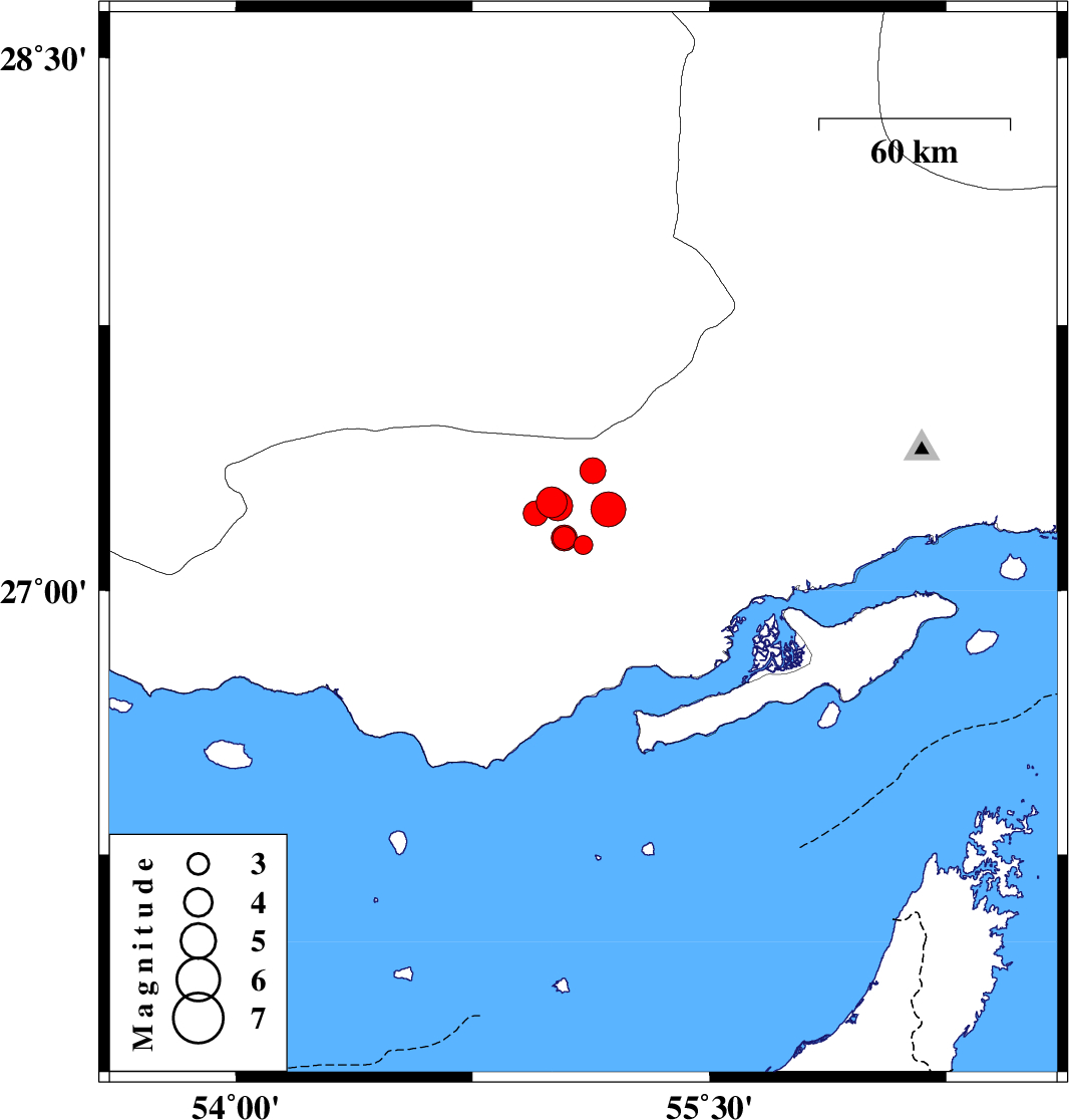 2013/07/07 | 09:15:37.3 | 13:45:37.3 | 27.15 | 55.04 | 29 | ML:3.2 | Hormozgan Province, 67 km East of Bastak | ||