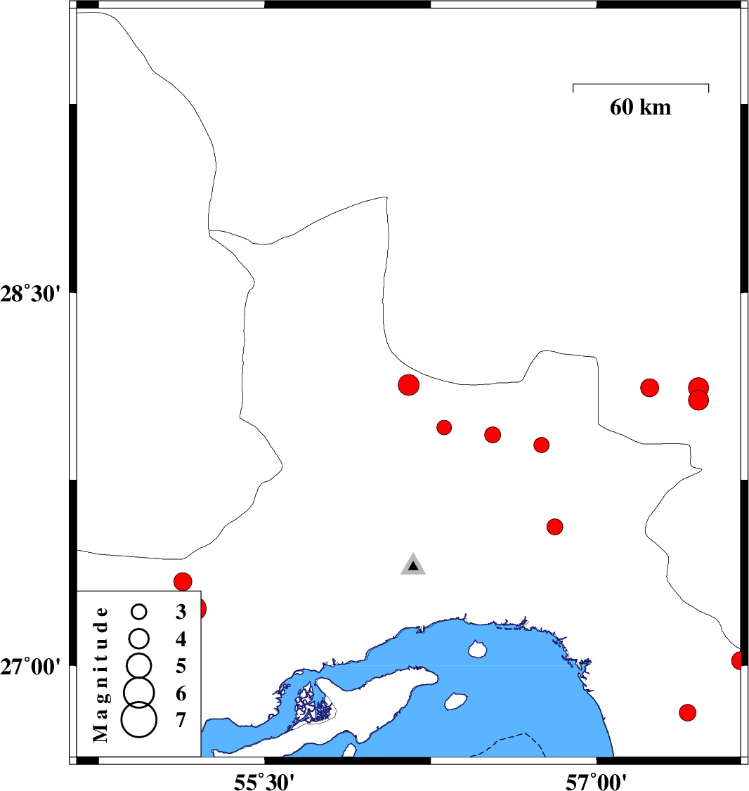 2013/06/12 | 17:23:52.3 | 21:53:52.3 | 26.81 | 57.41 | 15 | ML:3.4 | Hormozgan Province, 50 km South-East of Minab |