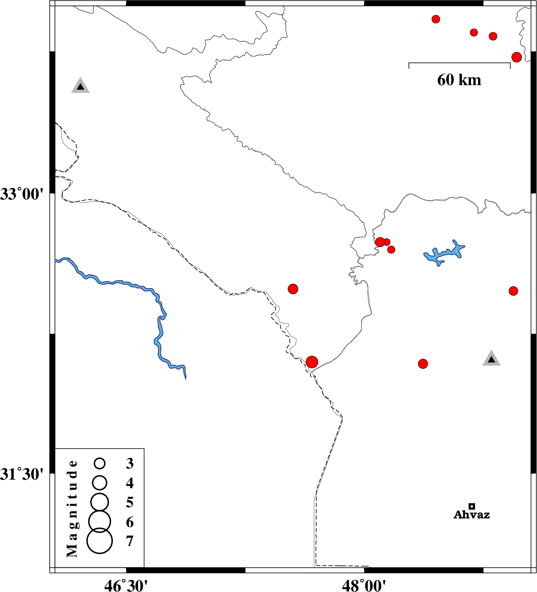 2013/07/14 | 15:15:55.5 | 19:45:55.5 | 32.1 | 47.67 | 18 | ML:3.4 | Ilam Province, 55 km West of Shush | ||
