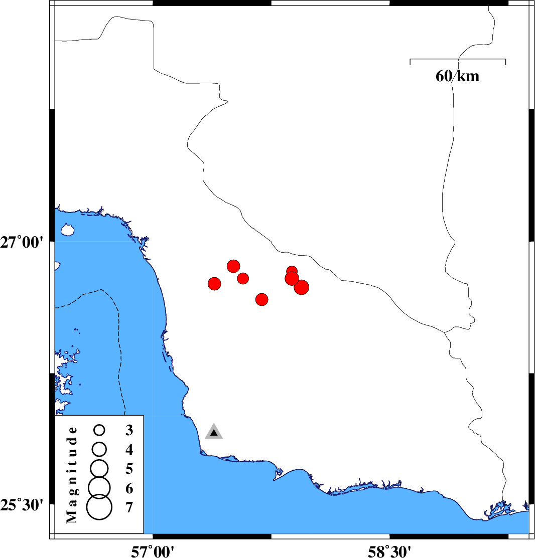 2013/07/12 | 14:03:32.3 | 18:33:32.3 | 26.86 | 57.51 | 14 | ML:3.7 | Hormozgan Province, 61 km South of Manujan |