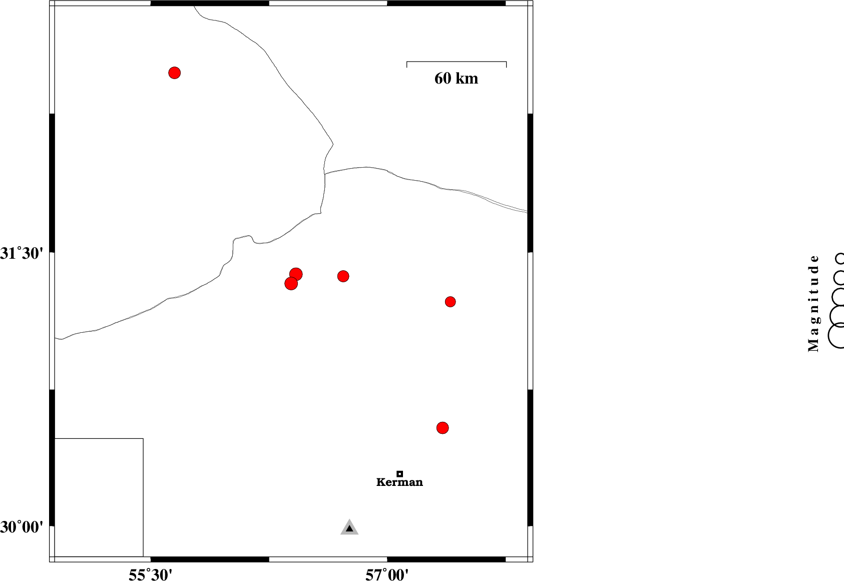 2013/06/26 | 19:05:04.3 | 23:35:04.3 | 31.37 | 56.72 | 14 | ML:3.2 | Kerman Province, 14 km Ravar |