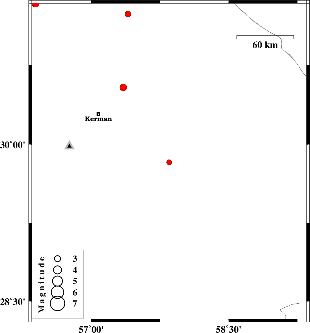 2013/07/10 | 23:53:34.8 | 04:23:34.8 | 30.54 | 57.35 | 14 | ML:3.4 | Kerman Province, 39 km North-East of Kerman |