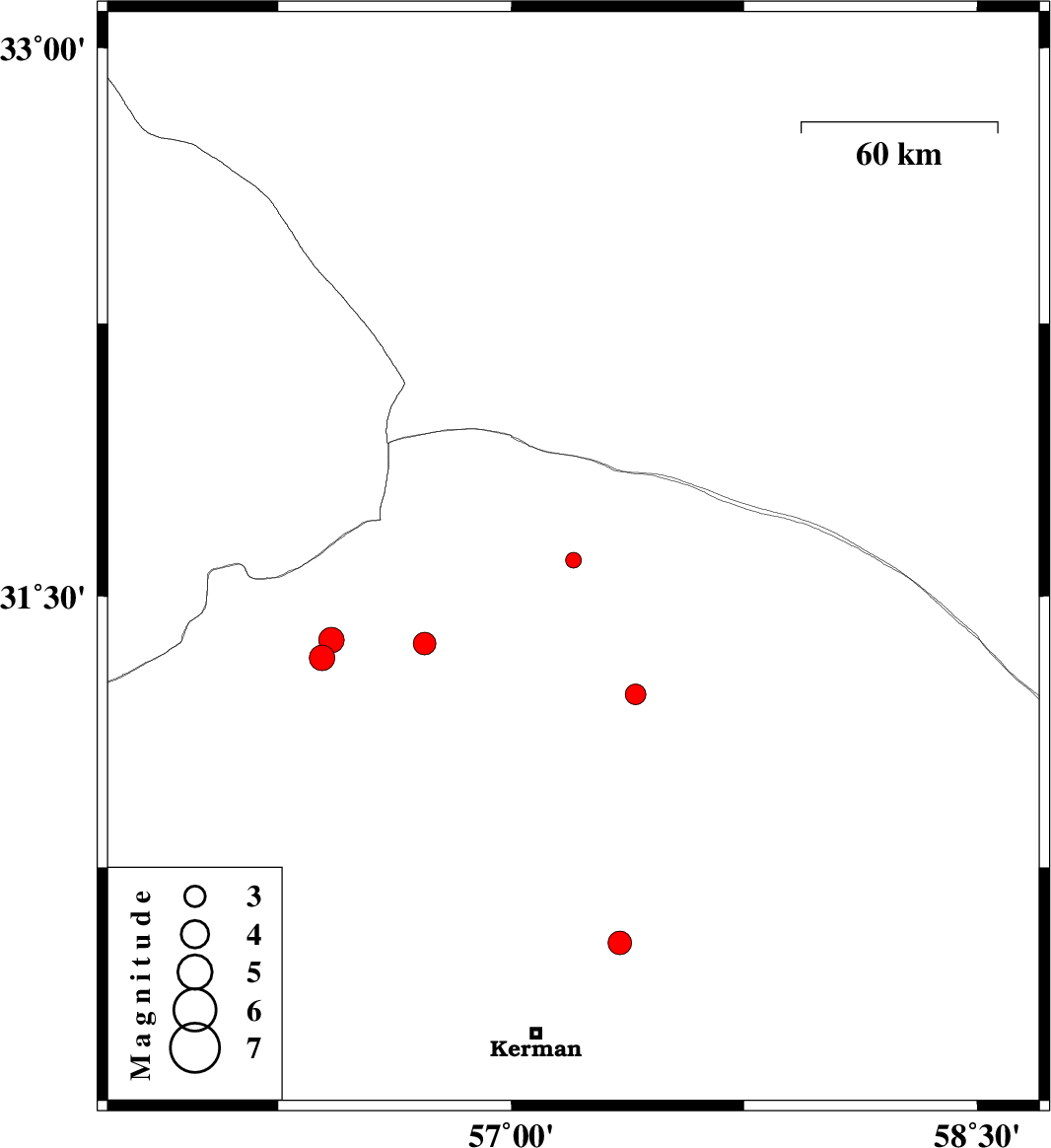 2013/06/26 | 19:05:04.3 | 23:35:04.3 | 31.37 | 56.72 | 14 | ML:3.2 | Kerman Province, 14 km Ravar |