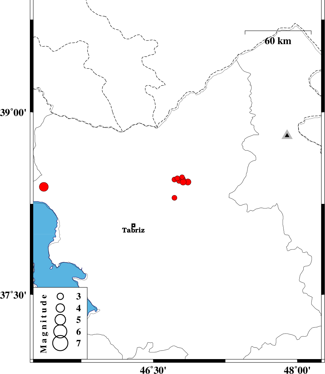 2013/06/27 | 21:22:49.7 | 01:52:49.7 | 38.3 | 46.72 | 14 | ML:2.4 | Azarbaijan Sharghi Province, 35 km West of Haris | ||