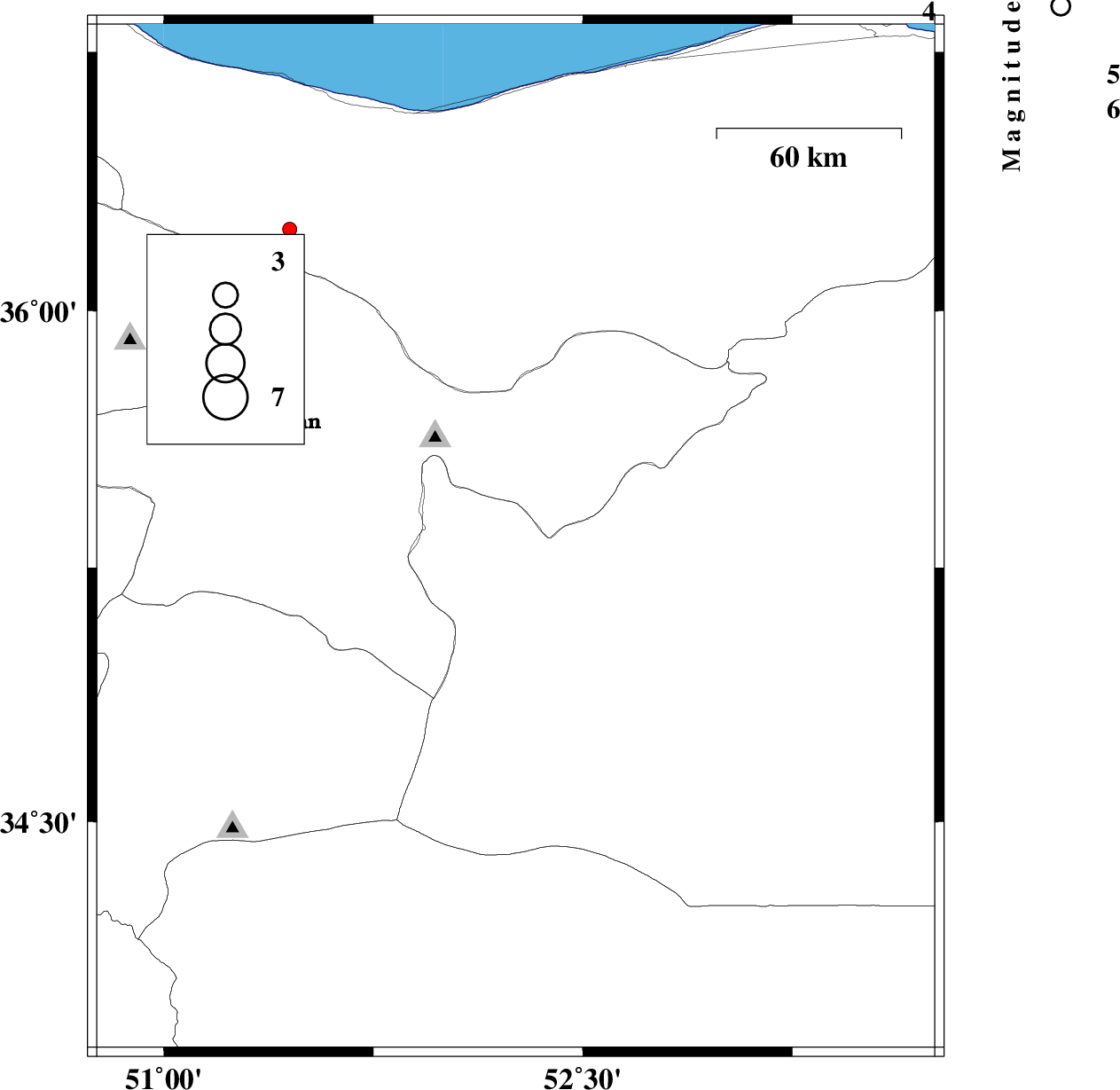 2013/07/23 | 06:21:50.8 | 10:51:50.8 | 35.33 | 52.26 | 27 | ML:2.4 | Semnan Province, 15 km North of Garmsar | ||