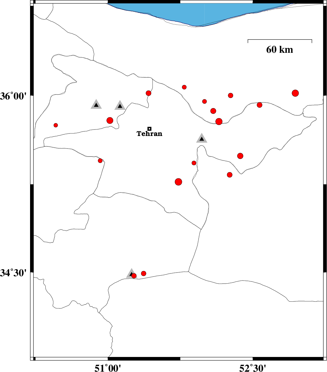 2013/06/29 | 17:14:27.9 | 21:44:27.9 | 35.45 | 50.92 | 17 | ML:2 | Markazi Province, 15 km West of Robatkarim | ||