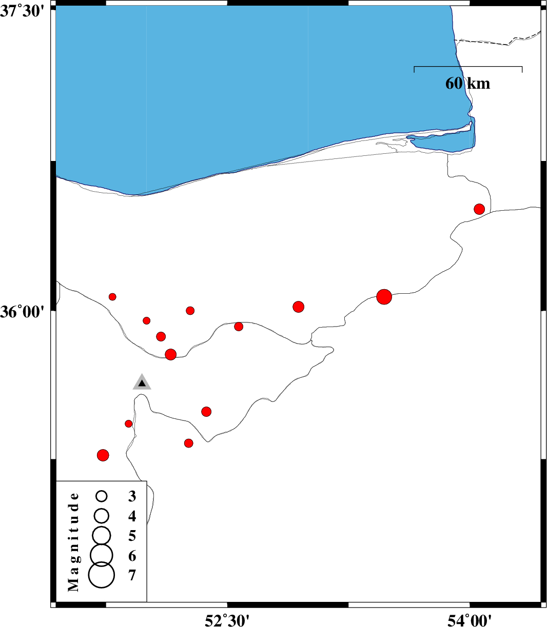 2013/07/24 | 08:04:53.1 | 12:34:53.1 | 36.02 | 52.94 | 14 | ML:3.1 | Mazandaran Province, 15 km West of Pol-E-Sefid | ||