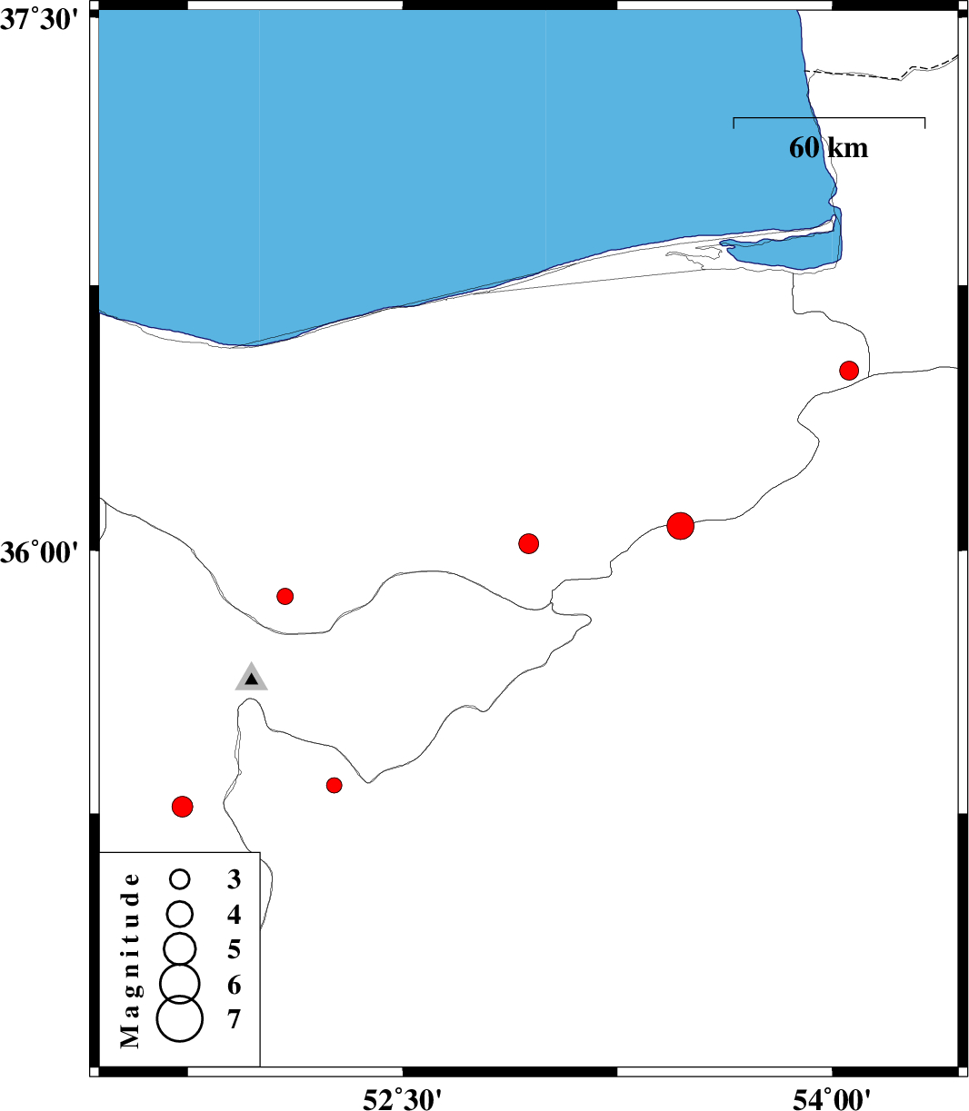 2013/07/24 | 08:04:53.1 | 12:34:53.1 | 36.02 | 52.94 | 14 | ML:3.1 | Mazandaran Province, 15 km West of Pol-E-Sefid | ||