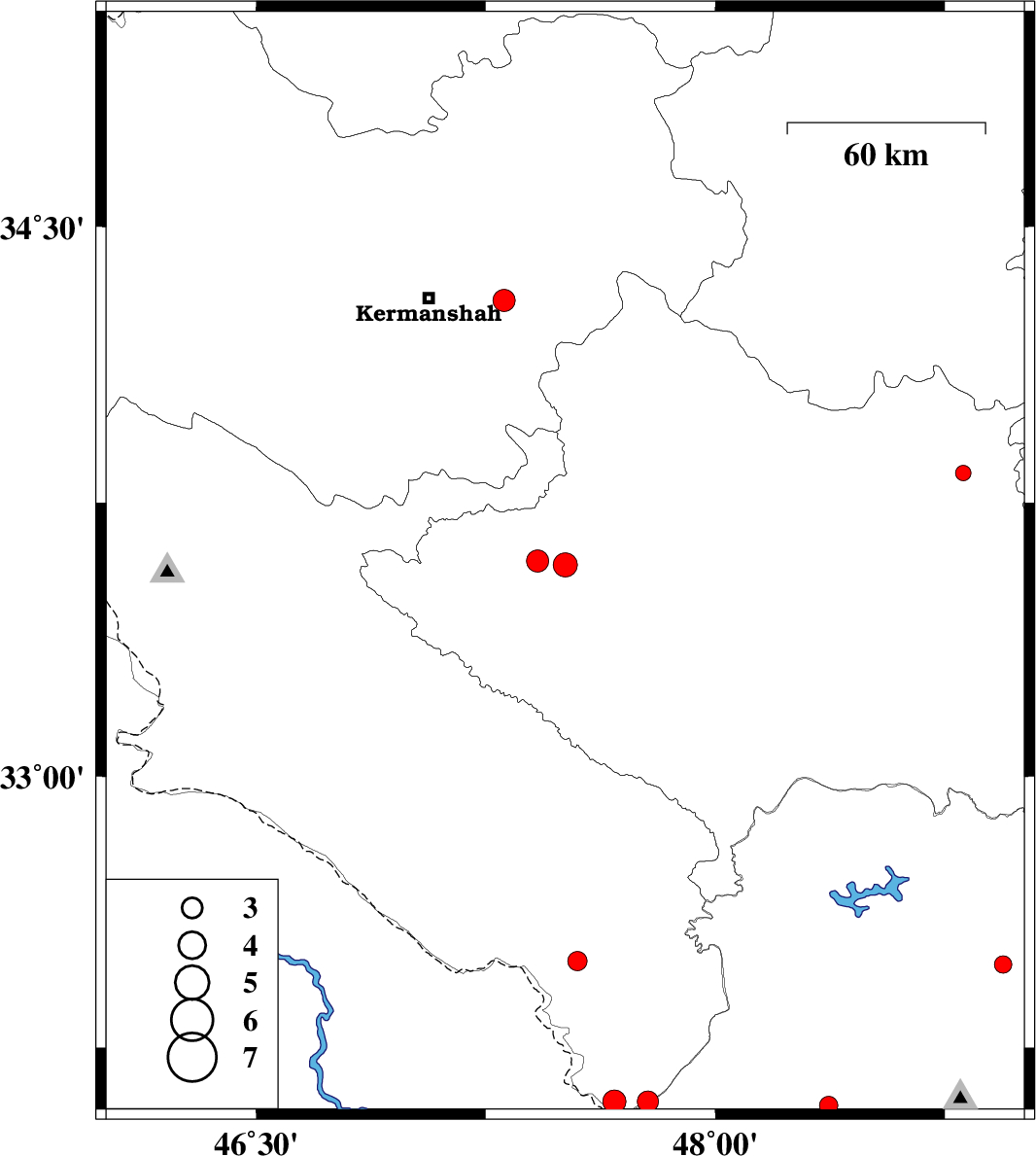 2013/07/09 | 18:32:36.1 | 23:02:36.1 | 34.3 | 47.31 | 18 | ML:3.3 | Kermanshah Province, 22 km East of Kermanshah | ||