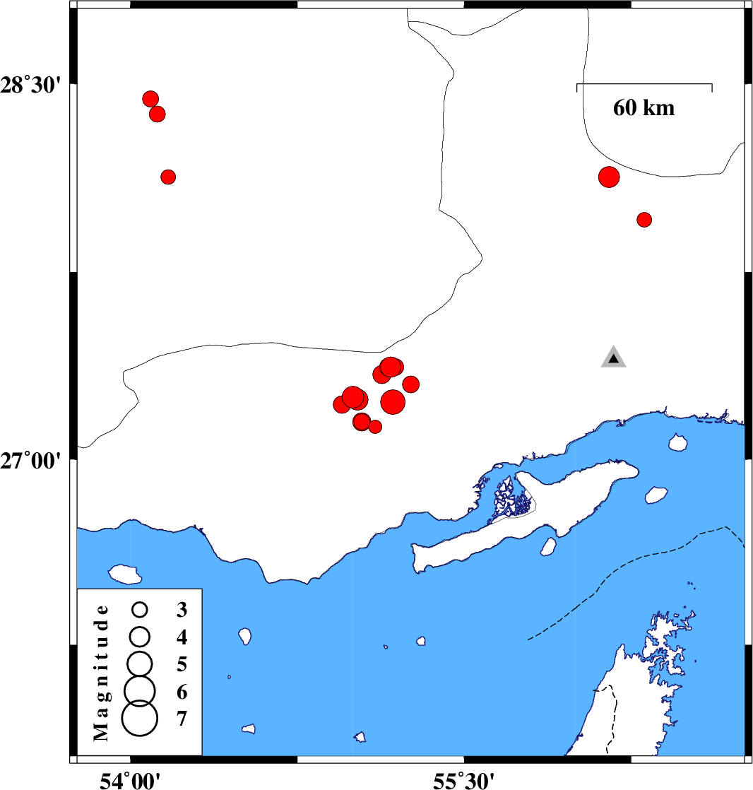 2013/07/09 | 17:05:10.8 | 21:35:10.8 | 28.13 | 56.15 | 18 | ML:4.2 | Hormozgan Province, 31 km South-East of Hajiabad | ||