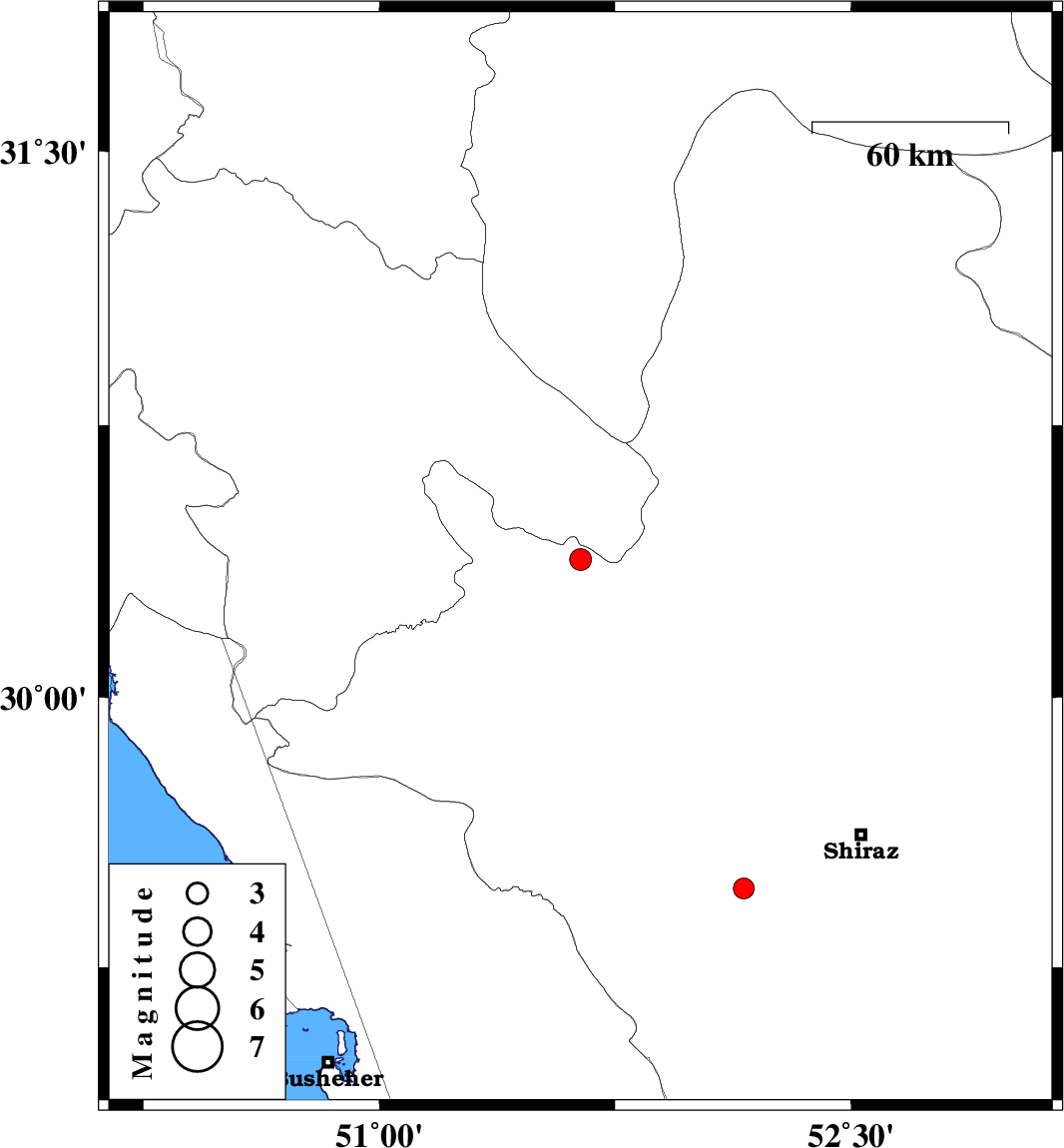 2013/06/30 | 22:01:46.3 | 02:31:46.3 | 29.47 | 52.16 | 14 | ML:3 | Fars Province, 40 km South-West of Shiraz |