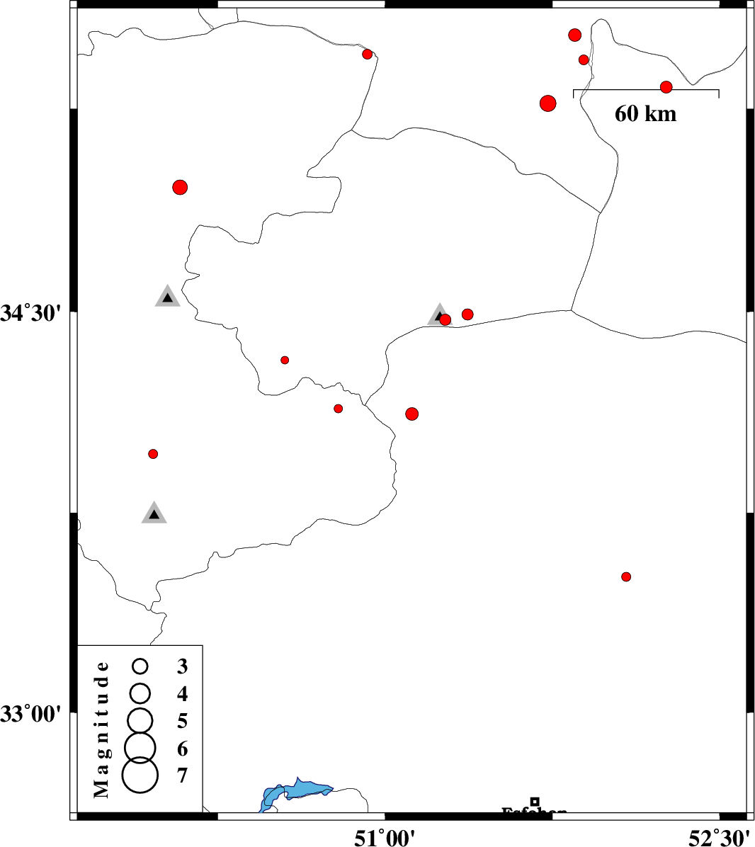 2013/07/18 | 09:40:16.2 | 14:10:16.2 | 33.97 | 49.96 | 9 | ML:1.8 | Markazi Province, 28 km South-East of Arak | ||