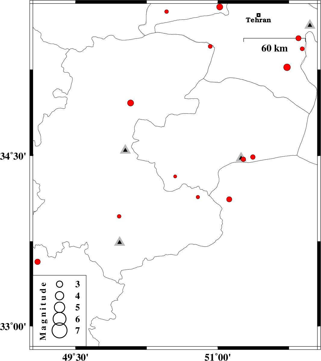 2013/07/18 | 09:40:16.2 | 14:10:16.2 | 33.97 | 49.96 | 9 | ML:1.8 | Markazi Province, 28 km South-East of Arak | ||