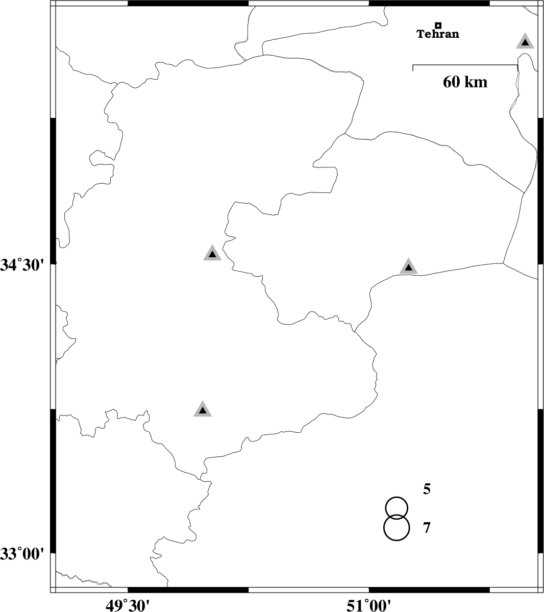 2013/07/22 | 18:11:55.5 | 22:41:55.5 | 34.96 | 50.08 | 14 | ML:2.9 | Markazi Province, 30 km North of Tafresh |