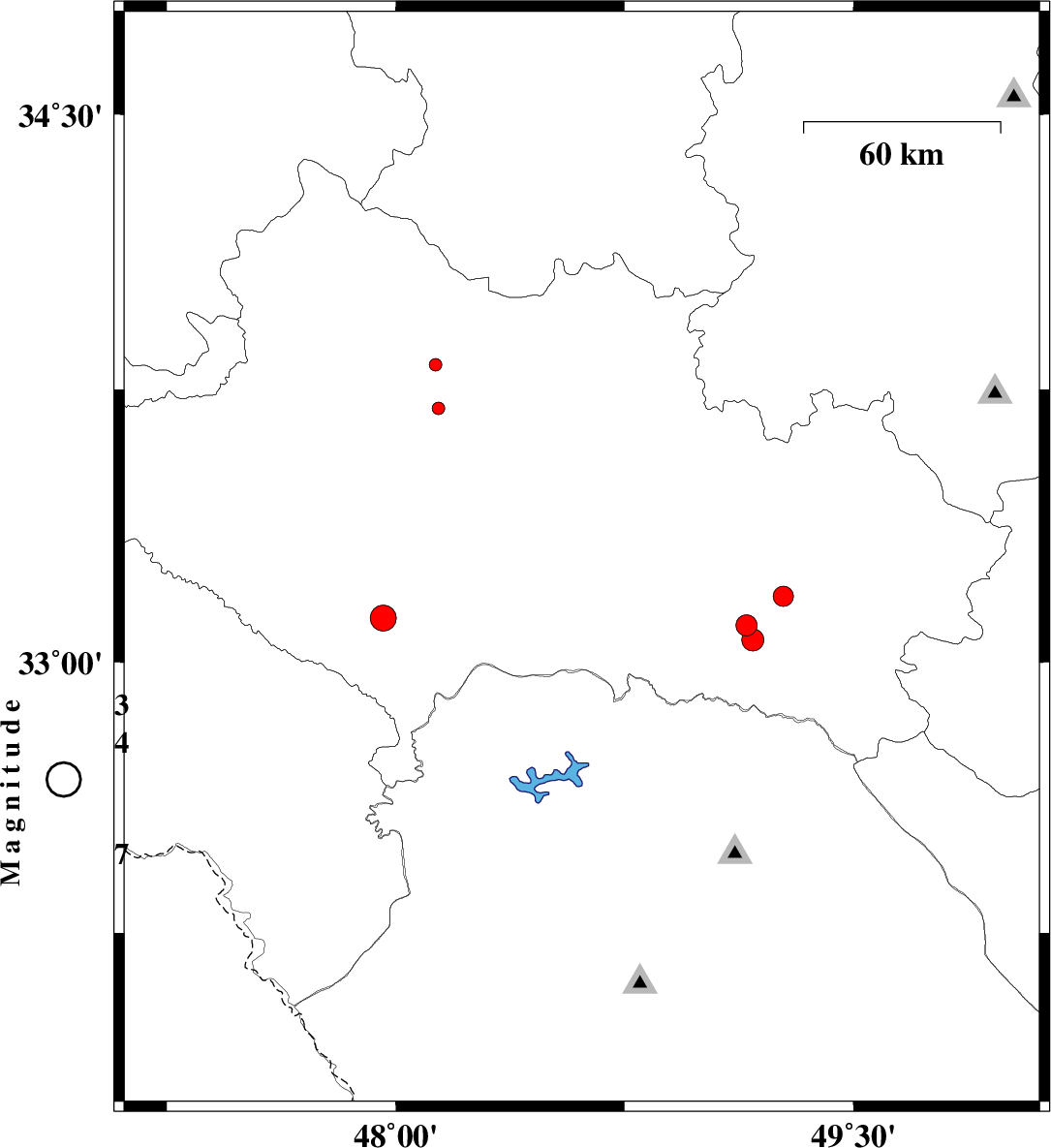 2013/07/25 | 03:26:23.8 | 07:56:23.8 | 33.59 | 47.42 | 15 | ML:3.2 | Lorestan Province, 19 km West of Kuhdasht |