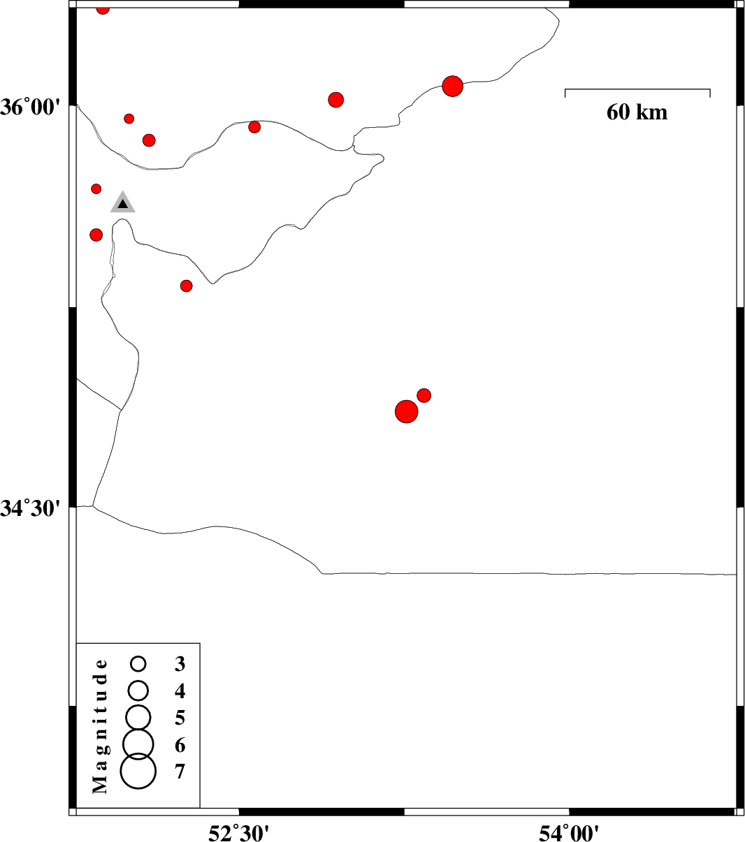 2013/08/03 | 15:25:07.3 | 19:55:07.3 | 34.86 | 53.26 | 15 | ML:4.7 | Semnan Province, 80 km South-West of Semnan | ||