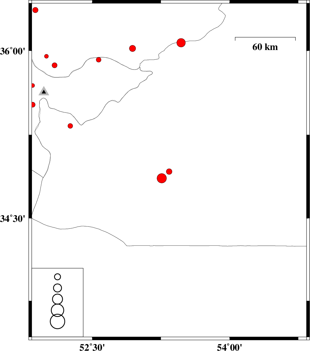 2013/07/17 20:00:30.9 00:30:30.9 35.8752.097 ML:2.5 Mazandaran Province, 17 km North of Damavand
