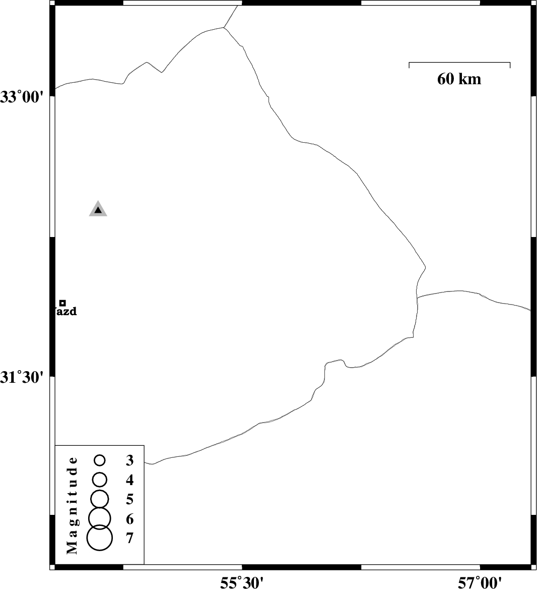| 2013/08/08 | 02:17:43.0 | 06:47:43.0 | 31.98 | 55.82 | 14 | ML:2.6 | Yazd Province, 58 km North-East of Bafq |
